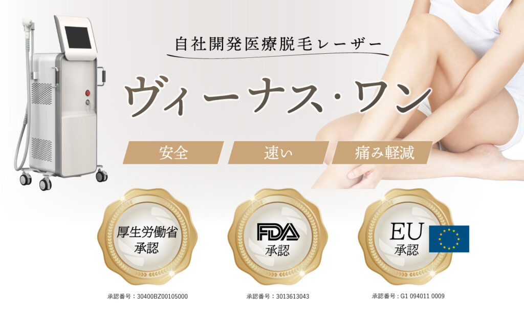 ヴィーナスワンは、国内でも多くのクリニックが採用している 厚生労働省承認の医療脱毛機器(承認取得モデルあり)で、安全性と効果の両面に優れています。